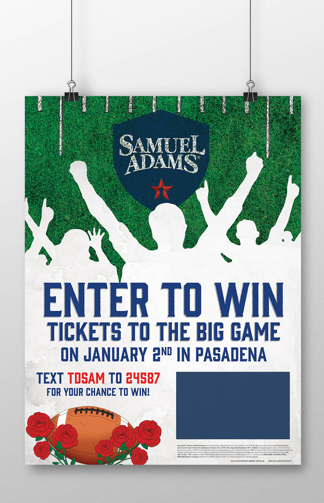 The fans are the focal point to give the viewer the feeling of being at the stadium since they could potentially win that chance. I art directed a fellow designer to create the rose, and football illustrations, which communicate the specific game this promotion refers to. This design worked as the basis for creating case easels, cooler stickers, banners, and other promotional items.