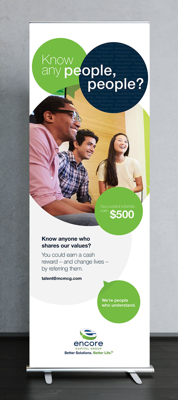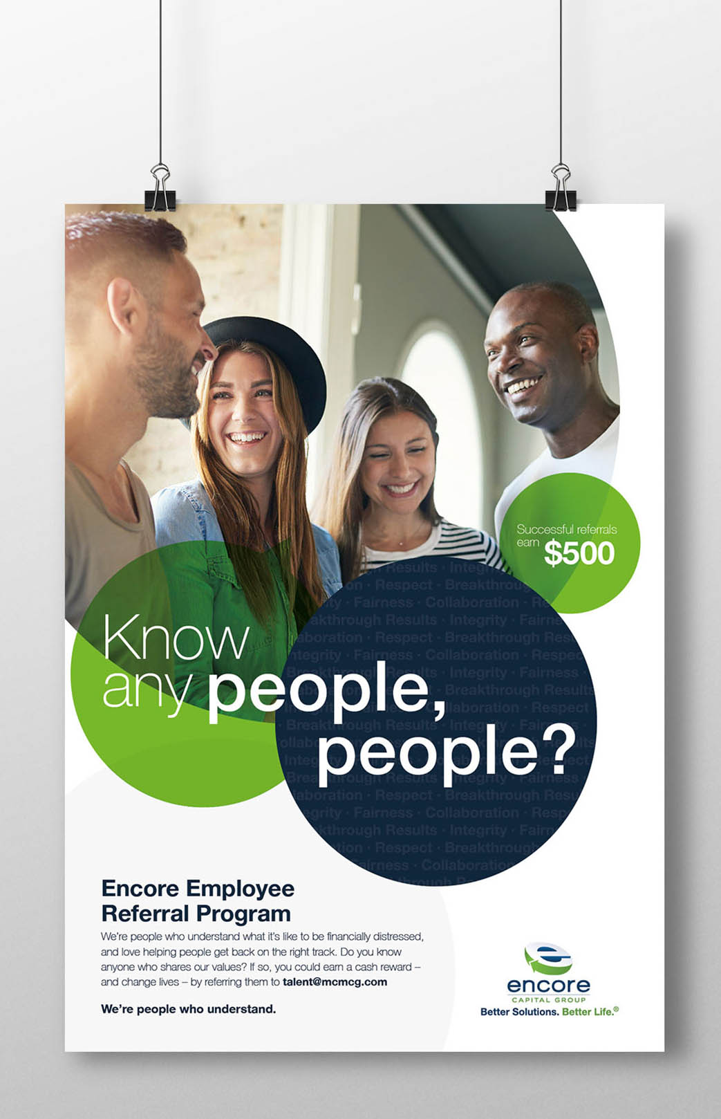 A complete rebrand of Encore's employer brand based on research into the best way to reach Encore's audience. This ongoing project includes all kinds of collateral and applications of the design.