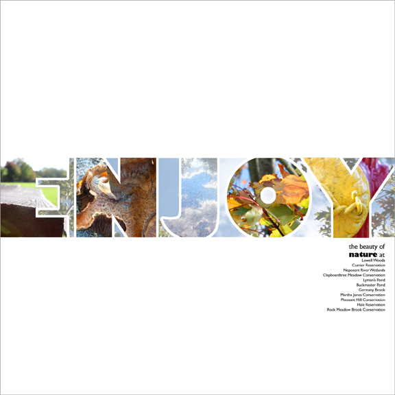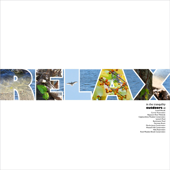 Created posters that encourage the viewer to visit the open spaces in town and promote the Land and Conservation Commission. The type treatment leads into the white space to emphasize the idea of open spaces. A National Scholastics Art & Writing award winner.