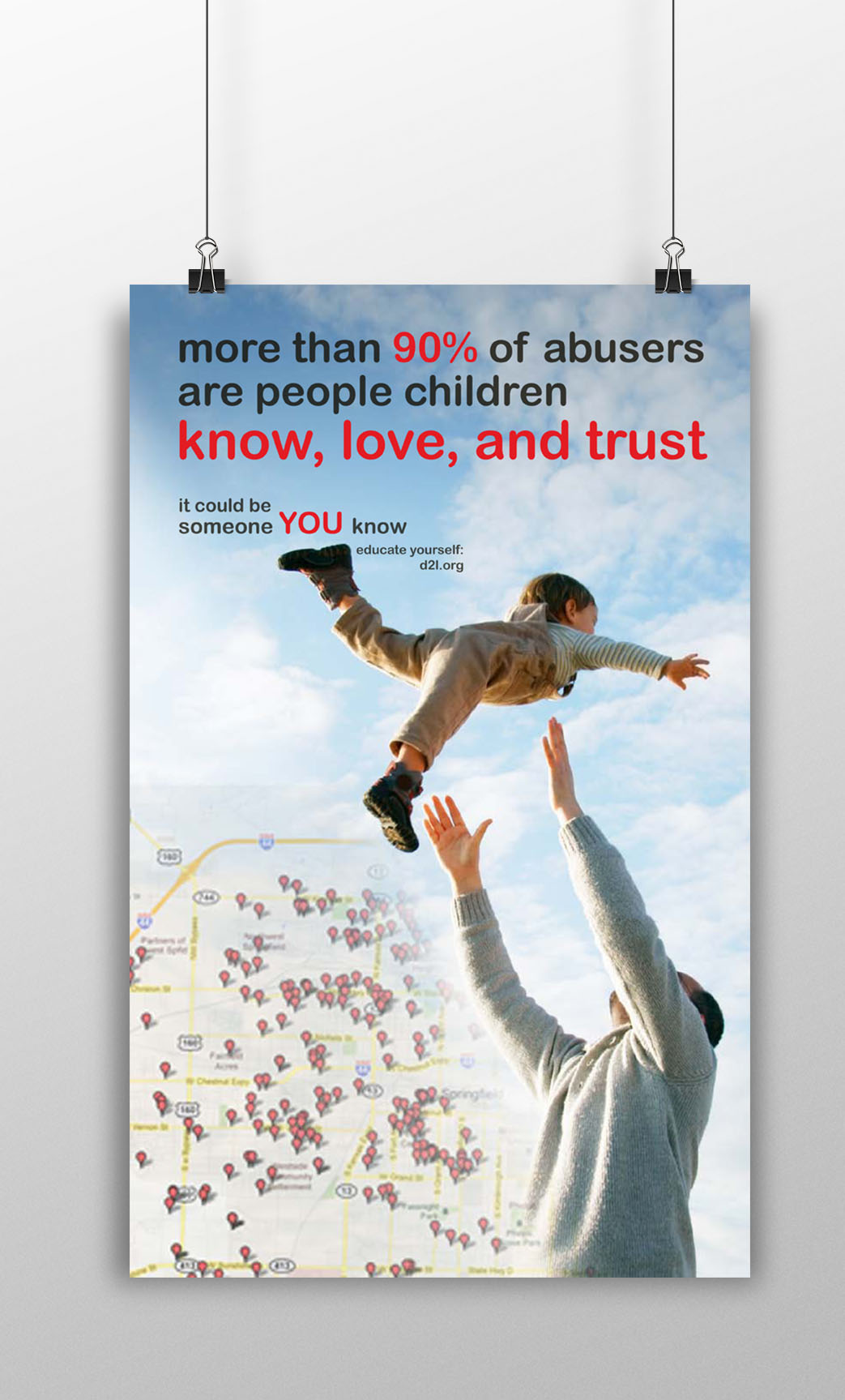 Someone YOU Know is an alarming - and even disturbing - call to action for the viewer on a prominent issue, child molestation. The image is taken out of the original context to make the viewer reconsider what they are looking at. I added the image of a map that points out where sex offenders reside to clearly call the viewer's attention to how crucial the issue is.