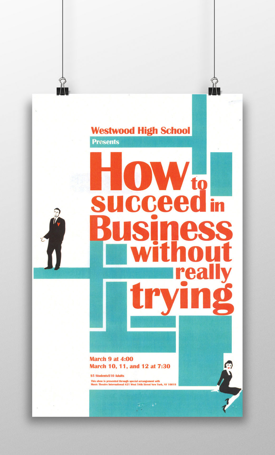 The final design was inspired by Piet Mondrian's grid-like compositions. The poster conveys the themes of the musical such as, the climb to the top, men and women's roles, and has a 50's feel. Was chosen to represent the musical and A National Scholastics Art & Writing award winner.