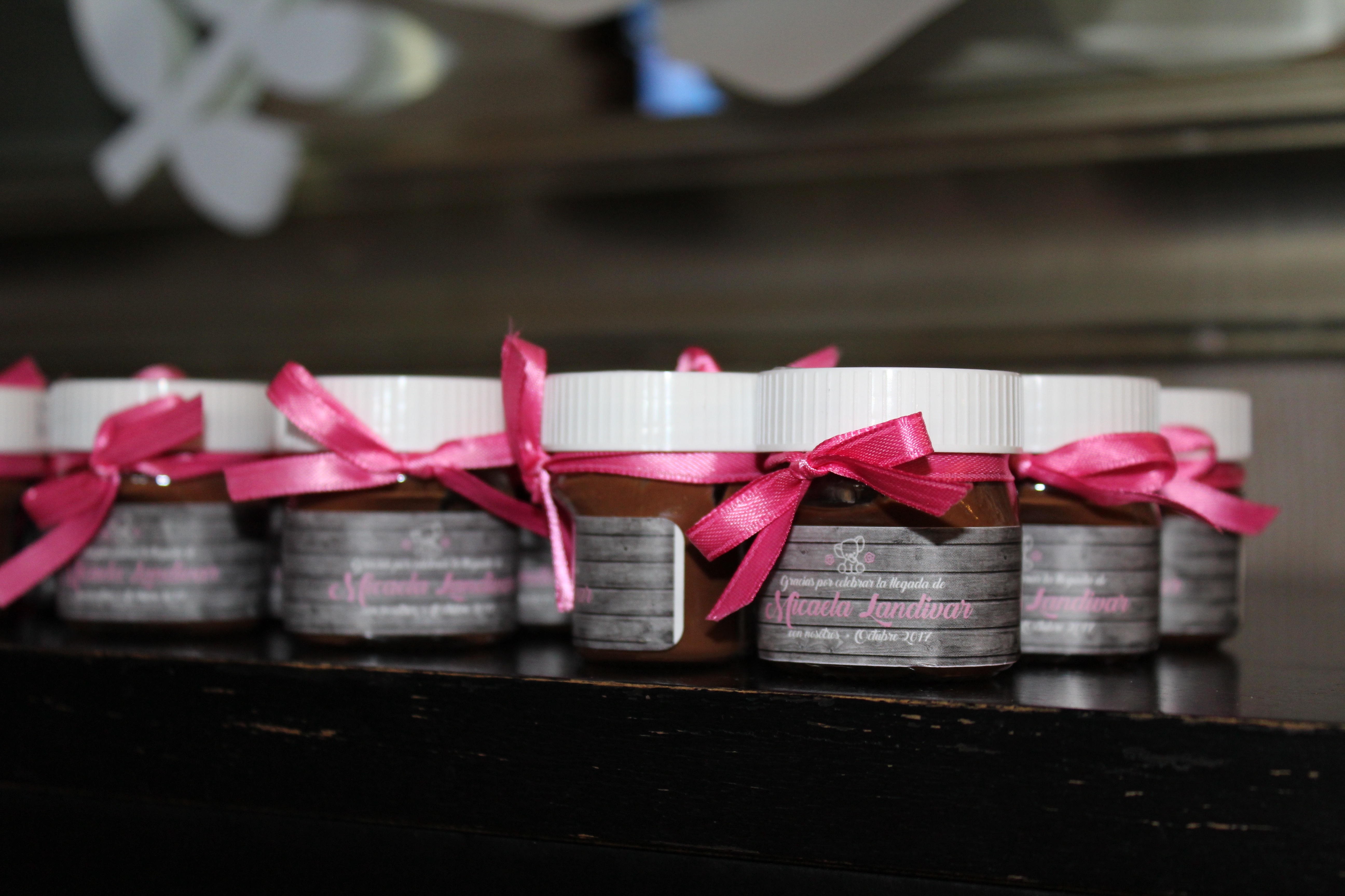 A client requested something special for her baby shower. After discussing her vision, I came up with relabeling mini Nutella bottles with the baby information, elephants, and a rustic field. The bottles were hand labeled on the top and front, and then tied pink bows on them.