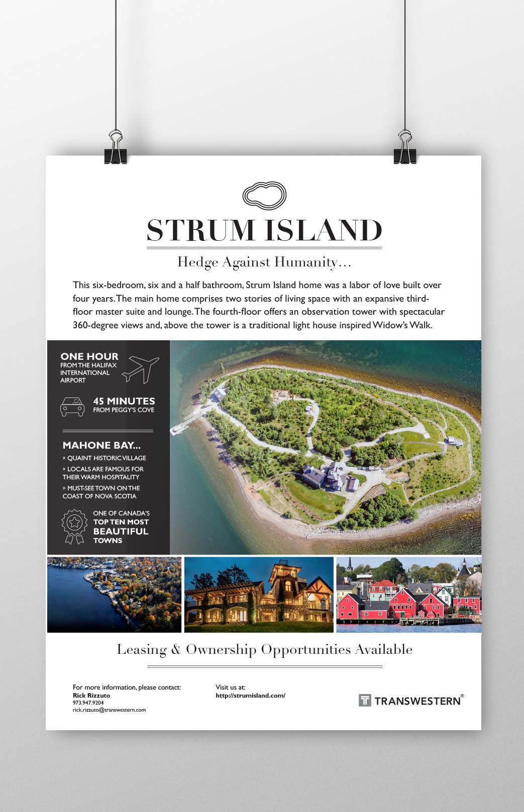 This flyer promotes Strum Island by showing some of the best features of the island and the beauty of the place. The overall look is simplistic but sophisticated.